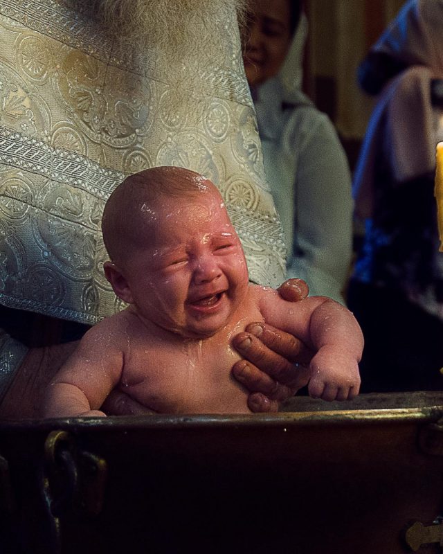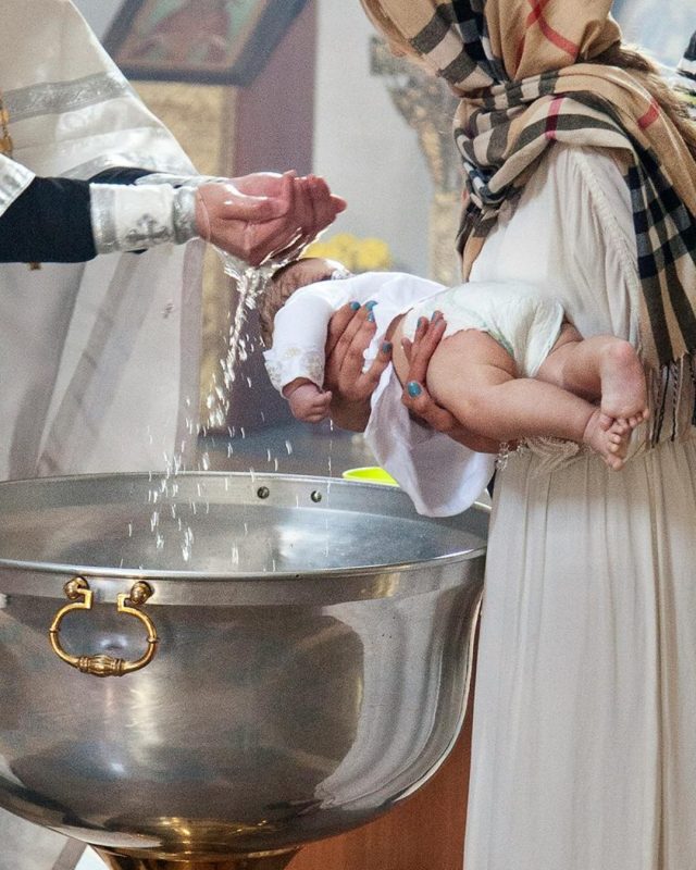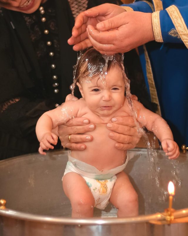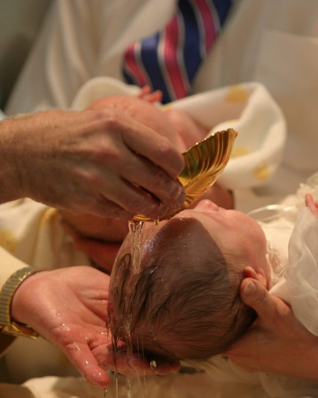 Le célébrant : « Je te baptise au nom du Père, et du Fils, et du Saint-Esprit »