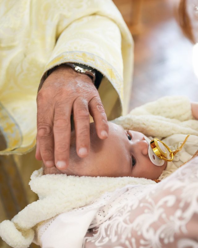 Après le geste de l’eau, le célébrant fait une nouvelle onction, cette fois avec le Saint Chrême, une huile parfumée consacrée par l’évêque. Il trace un signe de croix sur le front de l’enfant.